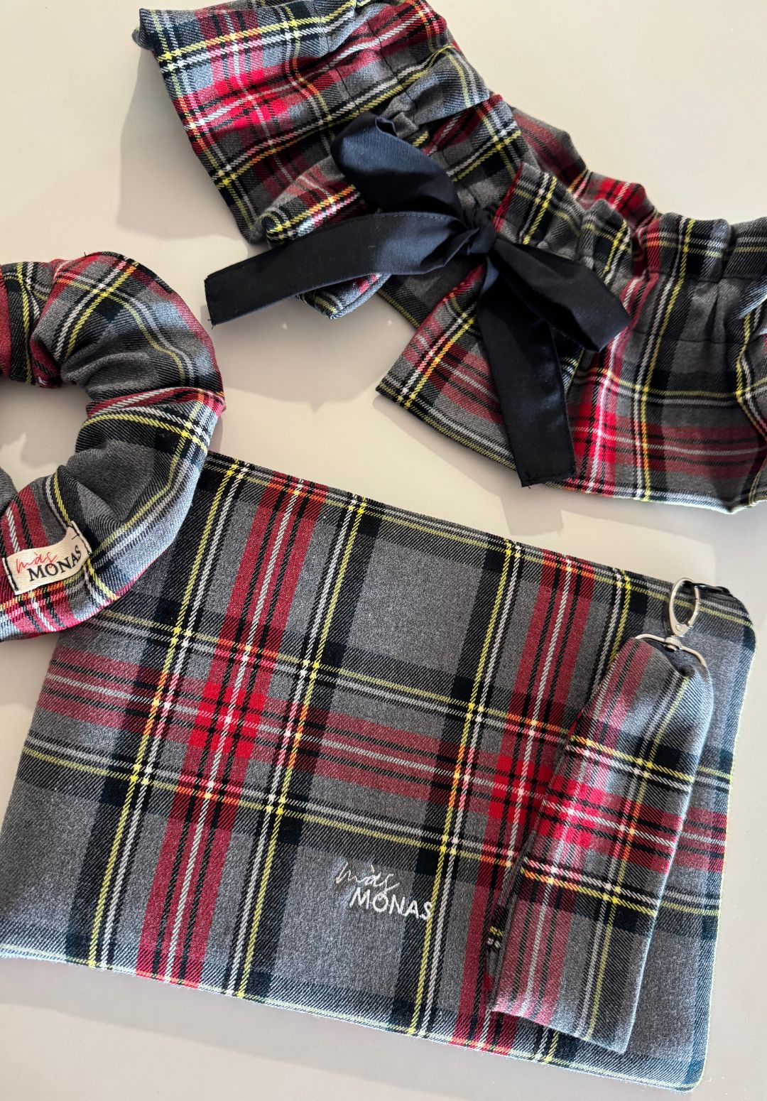 Descubre la funcionalidad del bolso de mano TARTÁN GRIS. Su diseño práctico incluye un colgador en la cremallera que se puede quitar lo cual permite llevarlo cómodamente como bolso de mano o muñeca o usarlo como un moderno neceser cuando sea necesario.